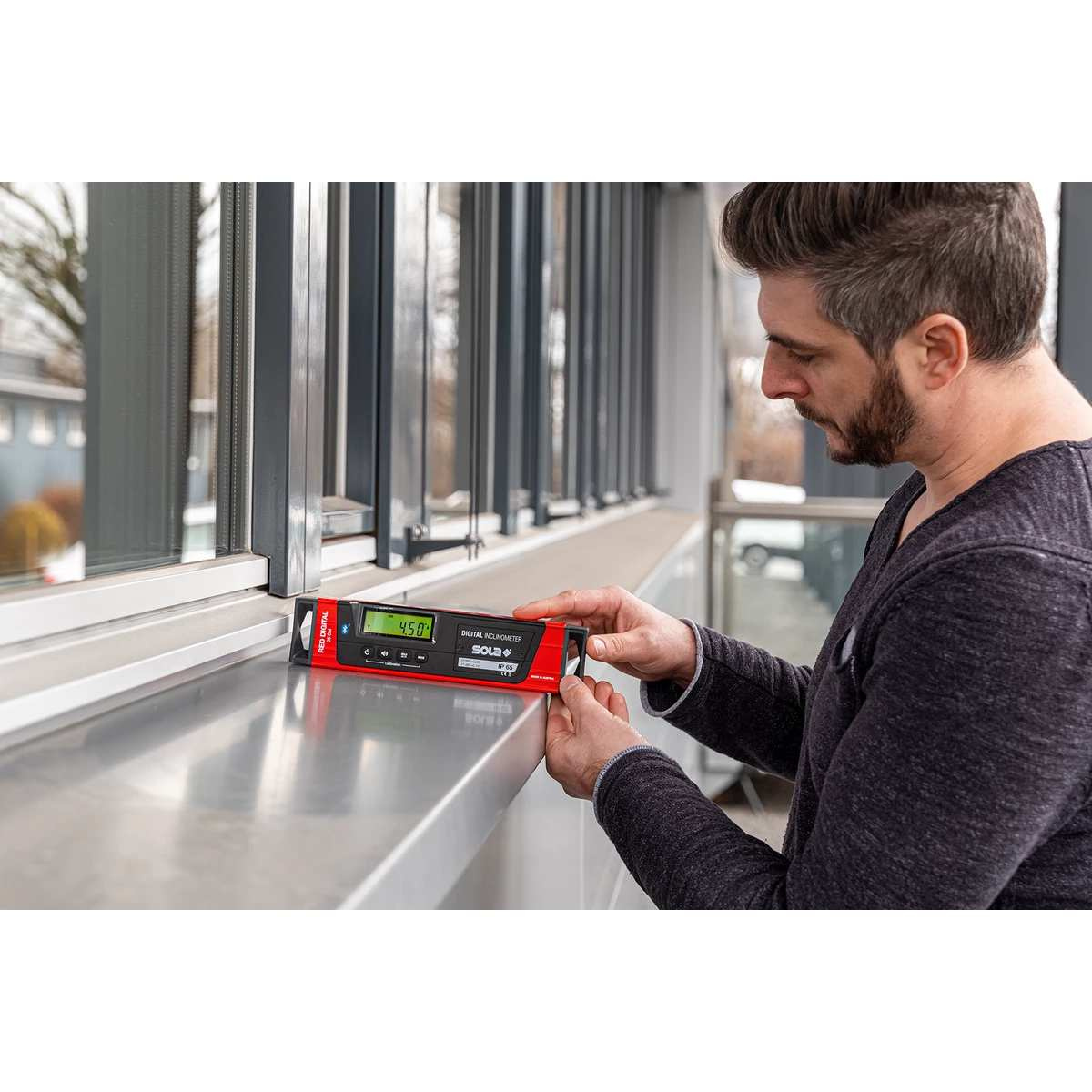 Vodováha digitální 25 cm, Bluetooth, 2 libely, hliník, červeno černá – SOLA RED 25 – 01730201.Digitální sklonoměr je určen pro přesné a pohodlné měření horizontálního a vertikálního úhlu v dílně, garáži, zahradě nebo na stavbě. Technologie Bluetooth umožňuje přehledný soupis výsledků přes aplikaci SOLA Measures.Vodováha umožňuje zobrazení sklonu v jednotkách °, %, mm/m a in/ft. Funkce „Hold“ slouží pro ukládání naměřených hodnot a pro přenos úhlů.Odečítání hodnot je možné díky reverznímu zobrazení při měření otočeném o 180°Technické parametry:• Délka: 25 cm• Počet libel: 2• Materiál: hliník• Stupeň krytí: IP65• Barva: červeno černá• Tolerance měření: 0.50 mm/m (0.029°)