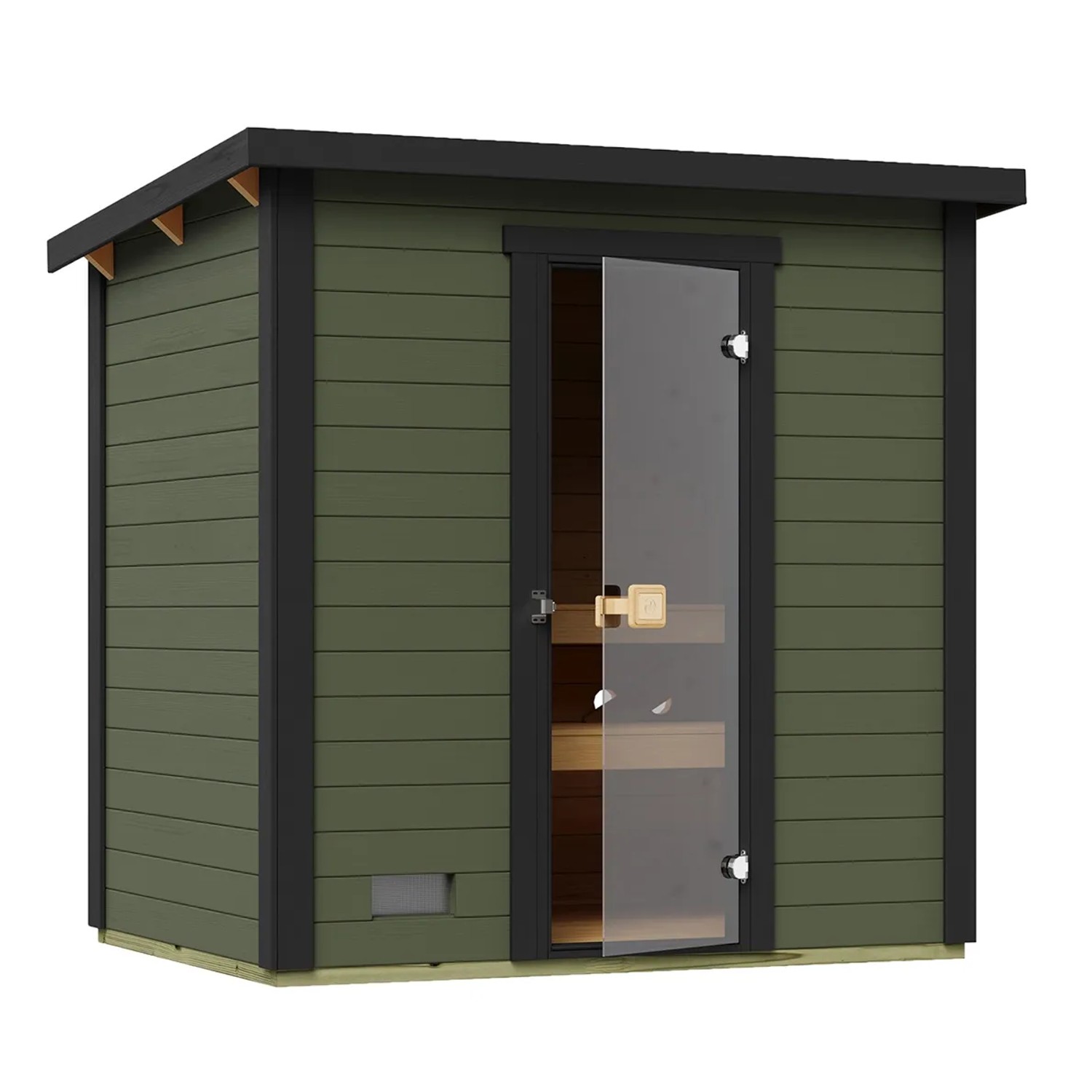 Venkovní sauna Kaapi 2: Kompaktní wellness přímo u vás doma Hledáte únik z každodenního shonu, ale nemáte na zahradě místa nazbyt? Saunový domek Kaapi 2 je ideálním řešením pro ty, kteří si chtějí dopřát luxus vlastního wellness i na menším prostoru nebo prostorném balkónu. Tento model kombinuje moderní design s vysokou funkčností a díky své konstrukci je připraven k rychlému vyhřátí. Klíčové vlastnosti produktu – Na první pohled zaujme svou elegantní šedozelenou barvou vnějšího smrkového dřeva, která harmonicky splyne s okolní přírodou – Interiér je ponechán v přirozeném přírodním stavu, což zajišťuje autentický zážitek z vůně dřeva během saunování.. – Robustní konstrukce: Stěny o tloušťce 40 mm zajišťují skvělou tepelnou izolaci a stabilitu. – Moderní design: Celoskleněné dveře z bezpečnostního skla opticky zvětšují prostor a dodávají sauně elegantní nádech. – Kompletní podlaha: Součástí balení je masivní dřevěná podlaha o tloušťce 19 mm. Technické parametry – Vnější rozměry (Š x H x V): 224 x 172 x 215 cm – Rozměr soklu (Š x H): 200 x 150 cm – Tloušťka stěny: 40 mm – Typ střechy: Plochá střecha (16 mm masivní dřevo) – Materiál: Smrkové dřevo – Dveře: Celoskleněné, bezpečnostní sklo (526 x 1755 mm) – Vnitřní vybavení: 2x lavice (šířka 55 cm) – Obestavěný prostor: 6,39 m3 Proč si vybrat právě model Kaapi? Tento „vstupní“ model do světa saunování je navržen s důrazem na energetickou efektivitu. Díky kompaktnímu vnitřnímu prostoru nebudete muset čekat hodiny, než se sauna nahřeje na požadovanou teplotu. Je to perfektní místo pro regeneraci po sportu nebo relaxaci po náročném pracovním dni, ať už saunujete sami, nebo v páru. Upozornění: Sauna je dodávána bez saunových kamen. To vám dává svobodu vybrat si typ vytápění, který vám nejvíce vyhovuje. Pro zastřešení je doporučeno dokoupit 1 balení střešní fólie/lepenky (5 m2).