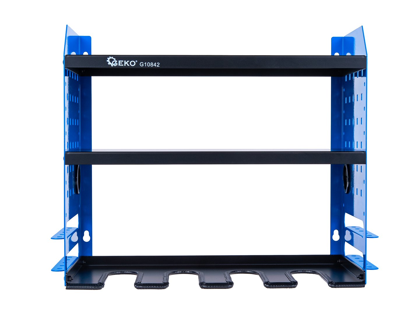 Pevná dílenská police je funkčním řešením pro skladování a rychlý přístup k nejčastěji používaným elektrickým nástrojům. Díky promyšlenému designu a konstrukci z oceli s práškovým nástřikem je police ideální do garáže, dílny, servisního vozu nebo haly.Je vybavena 4 přihrádkami na nářadí a 2 plnými policemi, což vám umožní uložit vrtačky, brusky, šroubováky a potřebné příslušenství na jednom místě.Možnost montáže polic na 7 úrovních vám umožňuje přizpůsobit uspořádání velikosti vašeho vybavení.4 přihrádky na elektrické nářadí (každá o rozměrech 4,5 x 14 cm) – speciální výřezy ve spodní polici umožňují rychlé zavěšení a vyjmutí nářadí jednou rukou. Jsou vhodné pro většinu běžných akumulátorových šroubováků a vrtaček.2 police o hloubce 22 cm a šířce 46 cm – prostor pro nabíječky, sady bitů, baterie nebo jiné lehké vybavení.7úrovňový montážní systém – individuální nastavení výšky police pro konkrétní nářadí umožňuje optimální využití prostoru pro nářadí různých velikostí.Boční stěny s otvory a lištami – možnost uložení šroubováků.Průchody kabelů s krytkami (2 ks) – pohodlné vedení kabelů z nabíječek bez zamotání nebo napětí. Usnadňuje organizaci napájení na pracovišti.Montáž na zeď pomocí 4 hmoždinek – zaručená stabilita i při plném zatížení. Systém funguje dobře jak na betonových, tak na OSB stěnách.Technická specifikace:Celková šířka: 51,5 cmCelková výška: 41 cmCelková hloubka: 22,5 cmStřední police (2x): 46 x 22 cm, výška každé: 2 cmSpodní police se štěrbinami: 46 x 22,5 cmVelikost jednotlivých otvorů: 4,5 x 14 cmObsah sady:Police Geko G108425 šroubů M5 5×50 mm s montážními kotvami13 šroubů s maticemi pro montáž2 průchodky kabelů s krytkami